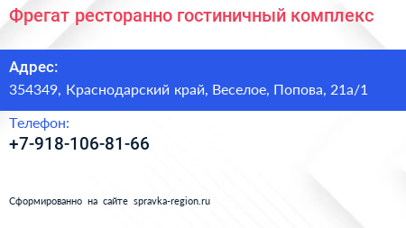 Фрегат, ресторанно-гостиничный комплекс по адресу 354349, Краснодарский край, Веселое, Попова, 21а/1 в дальнейшем Организация, размещена в следующих категориях: