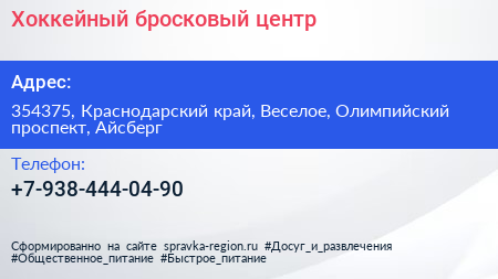 Хоккейный бросковый центр по адресу 354375, Краснодарский край, Веселое, Олимпийский проспект, Айсберг в дальнейшем Организация, размещена в следующих категориях: