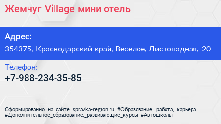 Жемчуг Village, мини-отель по адресу 354375, Краснодарский край, Веселое, Листопадная, 20 в дальнейшем Организация, размещена в следующих категориях: