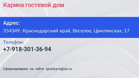 Карина, гостевой дом по адресу 354349, Краснодарский край, Веселое, Цимлянская, 17 в дальнейшем Организация, размещена в следующих категориях: