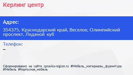 Керлинг-центр по адресу 354375, Краснодарский край, Веселое, Олимпийский проспект, Ледяной куб в дальнейшем Организация, размещена в следующих категориях: