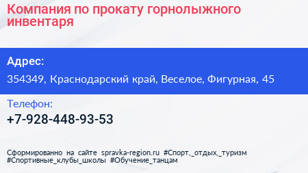 Компания по прокату горнолыжного инвентаря по адресу 354349, Краснодарский край, Веселое, Фигурная, 45 в дальнейшем Организация, размещена в следующих категориях: