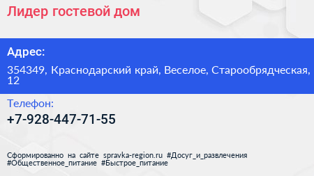 Лидер, гостевой дом по адресу 354349, Краснодарский край, Веселое, Старообрядческая, 12 в дальнейшем Организация, размещена в следующих категориях: