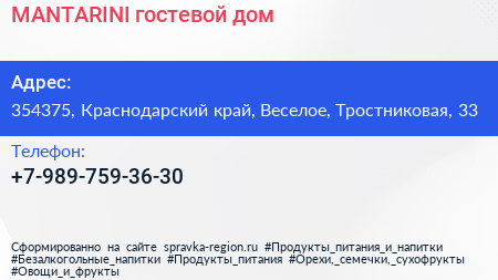 MANTARINI, гостевой дом по адресу 354375, Краснодарский край, Веселое, Тростниковая, 33 в дальнейшем Организация, размещена в следующих категориях: