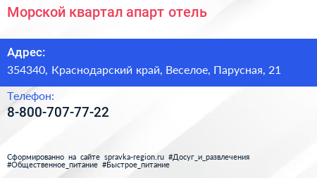 Морской квартал, апарт-отель по адресу 354340, Краснодарский край, Веселое, Парусная, 21 в дальнейшем Организация, размещена в следующих категориях: