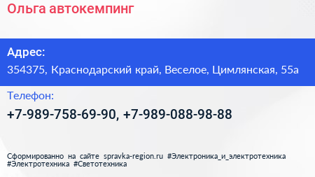 Ольга, автокемпинг по адресу 354375, Краснодарский край, Веселое, Цимлянская, 55а в дальнейшем Организация, размещена в следующих категориях: