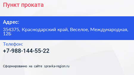 Пункт проката по адресу 354375, Краснодарский край, Веселое, Международная, 12Б в дальнейшем Организация, размещена в следующих категориях: