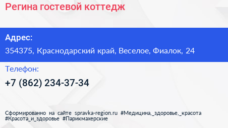 Регина, гостевой коттедж по адресу 354375, Краснодарский край, Веселое, Фиалок, 24 в дальнейшем Организация, размещена в следующих категориях: