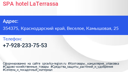 SPA-hotel LaTerrassa по адресу 354375, Краснодарский край, Веселое, Камышовая, 25 в дальнейшем Организация, размещена в следующих категориях: