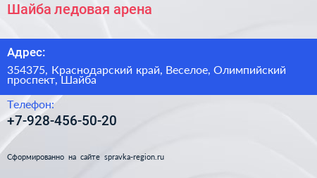Шайба, ледовая арена по адресу 354375, Краснодарский край, Веселое, Олимпийский проспект, Шайба в дальнейшем Организация, размещена в следующих категориях: