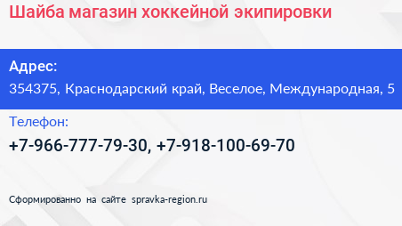 Шайба, магазин хоккейной экипировки по адресу 354375, Краснодарский край, Веселое, Международная, 5 в дальнейшем Организация, размещена в следующих категориях: