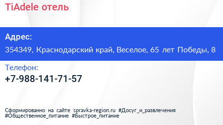 TiAdele, отель по адресу 354349, Краснодарский край, Веселое, 65 лет Победы, 8 в дальнейшем Организация, размещена в следующих категориях:
