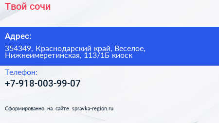 Твой сочи по адресу 354349, Краснодарский край, Веселое, Нижнеимеретинская, 113/1Б киоск в дальнейшем Организация, размещена в следующих категориях: