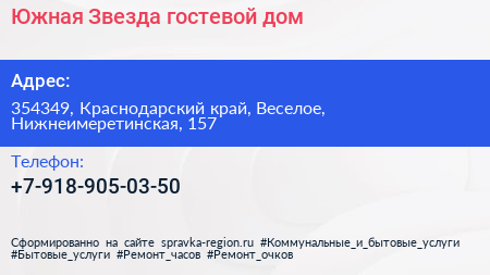 Южная Звезда, гостевой дом по адресу 354349, Краснодарский край, Веселое, Нижнеимеретинская, 157 в дальнейшем Организация, размещена в следующих категориях: