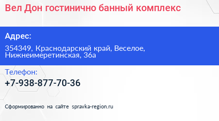 Вел Дон, гостинично-банный комплекс по адресу 354349, Краснодарский край, Веселое, Нижнеимеретинская, 36а в дальнейшем Организация, размещена в следующих категориях: