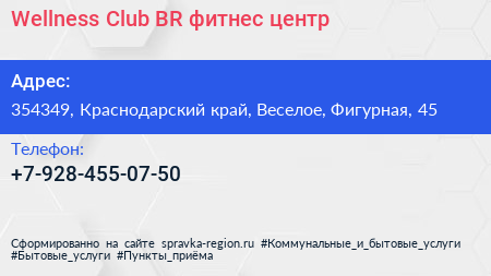 Wellness Club BR, фитнес-центр по адресу 354349, Краснодарский край, Веселое, Фигурная, 45 в дальнейшем Организация, размещена в следующих категориях:
