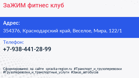 ЗаЖИМ, фитнес-клуб по адресу 354376, Краснодарский край, Веселое, Мира, 122/1 в дальнейшем Организация, размещена в следующих категориях:
