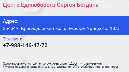 Центр Единоборств Сергея Богдана по адресу 354349, Краснодарский край, Веселое, Урицкого, 18/а в дальнейшем Организация, размещена в следующих категориях: