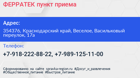 ФЕРРАТЕК, пункт приема по адресу 354376, Краснодарский край, Веселое, Васильковый переулок, 17а в дальнейшем Организация, размещена в следующих категориях: