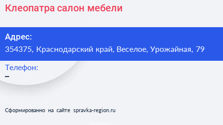 Клеопатра, салон мебели по адресу 354375, Краснодарский край, Веселое, Урожайная, 79 в дальнейшем Организация, размещена в следующих категориях: