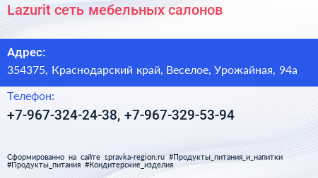 Lazurit, сеть мебельных салонов по адресу 354375, Краснодарский край, Веселое, Урожайная, 94а в дальнейшем Организация, размещена в следующих категориях: