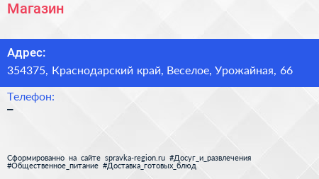 Магазин по адресу 354375, Краснодарский край, Веселое, Урожайная, 66 в дальнейшем Организация, размещена в следующих категориях: