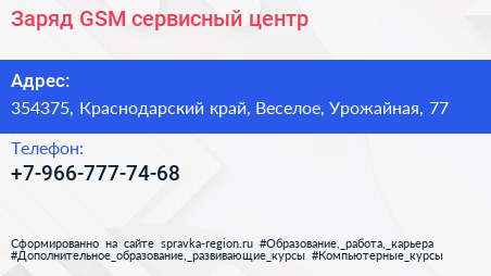 Заряд GSM, сервисный центр по адресу 354375, Краснодарский край, Веселое, Урожайная, 77 в дальнейшем Организация, размещена в следующих категориях: