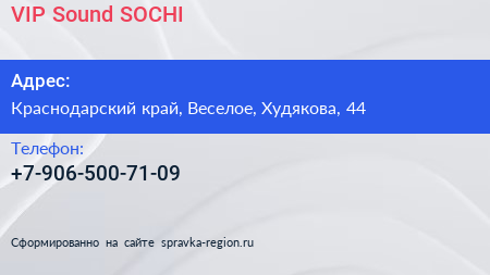 VIP Sound SOCHI по адресу Краснодарский край, Веселое, Худякова, 44 в дальнейшем Организация, размещена в следующих категориях:
