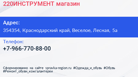 220ИНСТРУМЕНТ, магазин по адресу 354354, Краснодарский край, Веселое, Лесная, 5а в дальнейшем Организация, размещена в следующих категориях: