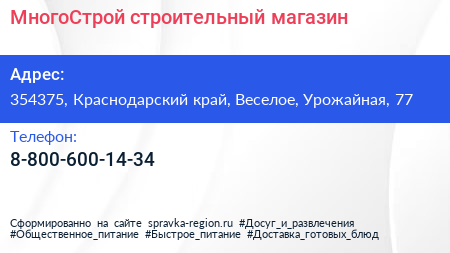 МногоСтрой, строительный магазин по адресу 354375, Краснодарский край, Веселое, Урожайная, 77 в дальнейшем Организация, размещена в следующих категориях: