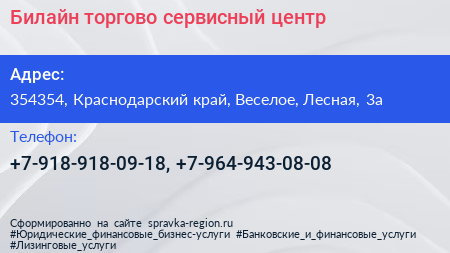 Билайн, торгово-сервисный центр по адресу 354354, Краснодарский край, Веселое, Лесная, 3а в дальнейшем Организация, размещена в следующих категориях: