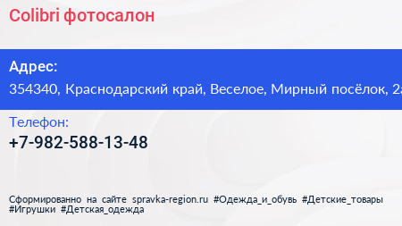 Colibri, фотосалон по адресу 354340, Краснодарский край, Веселое, Мирный посёлок, 2а в дальнейшем Организация, размещена в следующих категориях: