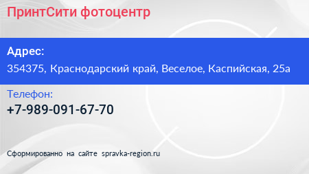 ПринтСити, фотоцентр по адресу 354375, Краснодарский край, Веселое, Каспийская, 25а в дальнейшем Организация, размещена в следующих категориях: