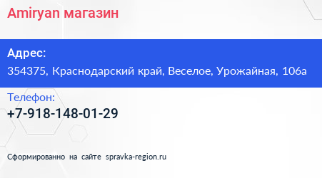 Amiryan, магазин по адресу 354375, Краснодарский край, Веселое, Урожайная, 106а в дальнейшем Организация, размещена в следующих категориях:
