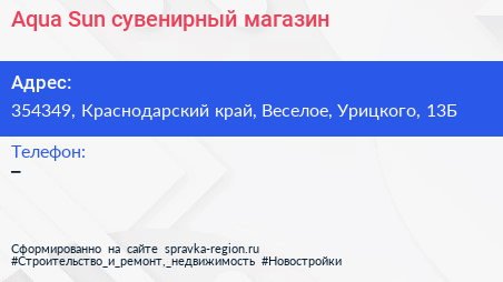 Aqua Sun, сувенирный магазин по адресу 354349, Краснодарский край, Веселое, Урицкого, 13Б в дальнейшем Организация, размещена в следующих категориях: