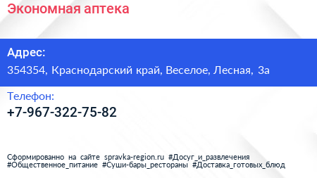 Экономная аптека по адресу 354354, Краснодарский край, Веселое, Лесная, 3а в дальнейшем Организация, размещена в следующих категориях: