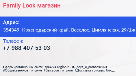 Family Look, магазин по адресу 354349, Краснодарский край, Веселое, Цимлянская, 29/1ж в дальнейшем Организация, размещена в следующих категориях: