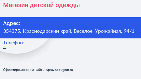 Магазин детской одежды по адресу 354375, Краснодарский край, Веселое, Урожайная, 94/1 в дальнейшем Организация, размещена в следующих категориях:
