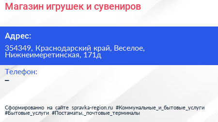 Магазин игрушек и сувениров по адресу 354349, Краснодарский край, Веселое, Нижнеимеретинская, 171д в дальнейшем Организация, размещена в следующих категориях:
