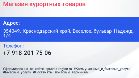 Магазин курортных товаров по адресу 354349, Краснодарский край, Веселое, бульвар Надежд, 1/4 в дальнейшем Организация, размещена в следующих категориях: