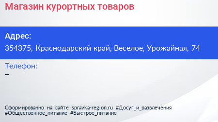 Магазин курортных товаров по адресу 354375, Краснодарский край, Веселое, Урожайная, 74 в дальнейшем Организация, размещена в следующих категориях:
