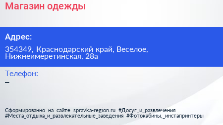Магазин одежды по адресу 354349, Краснодарский край, Веселое, Нижнеимеретинская, 28а в дальнейшем Организация, размещена в следующих категориях: