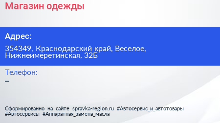 Магазин одежды по адресу 354349, Краснодарский край, Веселое, Нижнеимеретинская, 32Б в дальнейшем Организация, размещена в следующих категориях: