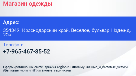 Магазин одежды по адресу 354349, Краснодарский край, Веселое, бульвар Надежд, 20а в дальнейшем Организация, размещена в следующих категориях:
