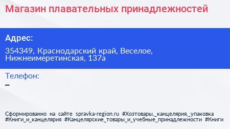 Магазин плавательных принадлежностей по адресу 354349, Краснодарский край, Веселое, Нижнеимеретинская, 137а в дальнейшем Организация, размещена в следующих категориях: