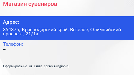 Магазин сувениров по адресу 354375, Краснодарский край, Веселое, Олимпийский проспект, 21/1а в дальнейшем Организация, размещена в следующих категориях: