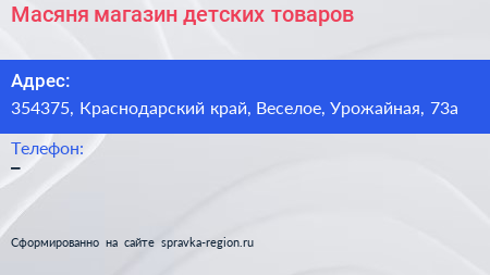 Масяня, магазин детских товаров по адресу 354375, Краснодарский край, Веселое, Урожайная, 73а в дальнейшем Организация, размещена в следующих категориях: