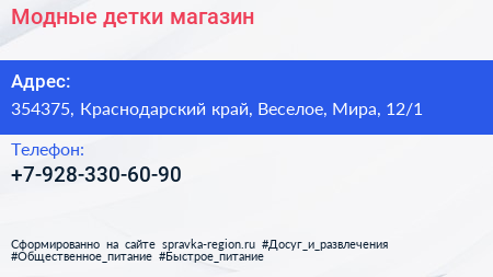 Модные детки, магазин по адресу 354375, Краснодарский край, Веселое, Мира, 12/1 в дальнейшем Организация, размещена в следующих категориях: