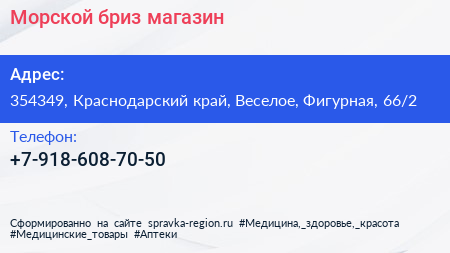 Морской бриз, магазин по адресу 354349, Краснодарский край, Веселое, Фигурная, 66/2 в дальнейшем Организация, размещена в следующих категориях: