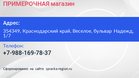 ПРИМЕРОЧНАЯ, магазин по адресу 354349, Краснодарский край, Веселое, бульвар Надежд, 1/7 в дальнейшем Организация, размещена в следующих категориях: